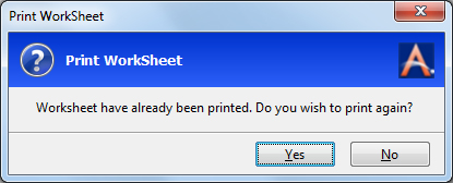 If the worksheets have been printed already, a Print WorkSheetPrint WorkSheet message, “Worksheets have already been printed. Do you wish to print again?” is displayed. Click Yes to print the Worksheets.