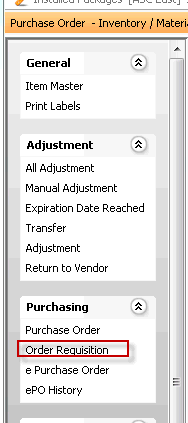 You can use the Order Requisition Sheet Bar optionOrder Requisition Sheet Bar option under the Purchasing heading in the Inventory Management module to affect purchases of materials/supplies. The Facility staff can also add items to a requisition when they feel that items need to be ordered, and the material manager can then review the requisitions and create purchase orders after review of the requisitions.