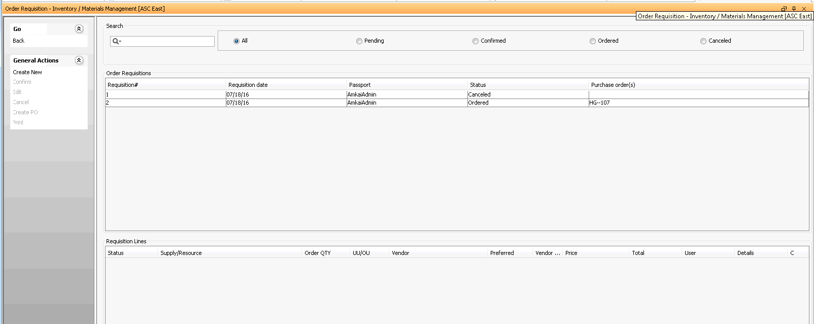 Click the Create New option under the General Actions group. The Order RequisitionOrder Requisition dialog appears.