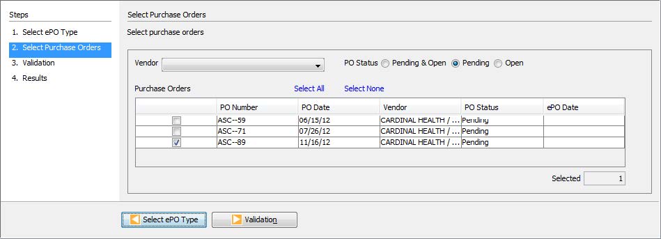Select the purchase orders you wish to include in the transmission by checking the appropriate check boxes. You can filter the PO list by Vendor and PO Status. You can also select all the POs, multiple POs or select none by selecting appropriate options.