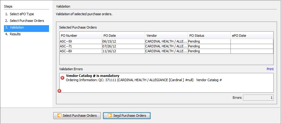 Click the next step, Validation. The ValidationValidation dialog will display any issues related to transmitting the purchase orders. Resolve any issues before sending the selected POs. You can print the error list from the Print link on the right.