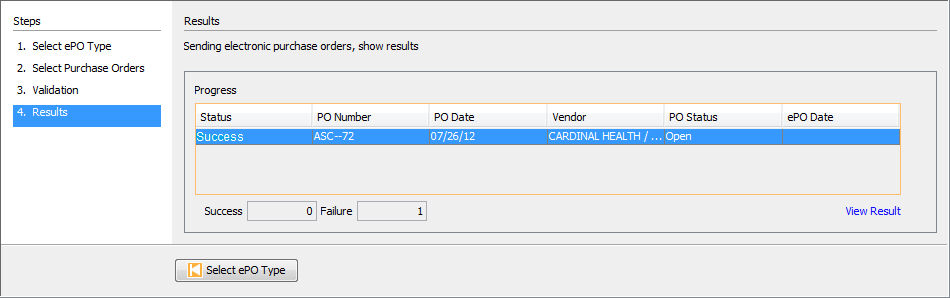 Once all errors are cleared click Send Purchase Orders. The Results dialog displays a status for each PO that was sent.