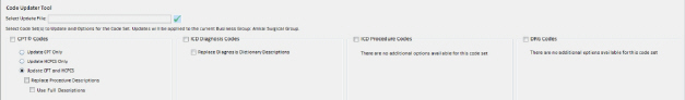 Updates are made to the CPT Code and Procedure dictionaries. You have the option to update either CPT or HCPCS codes or both at the same time.